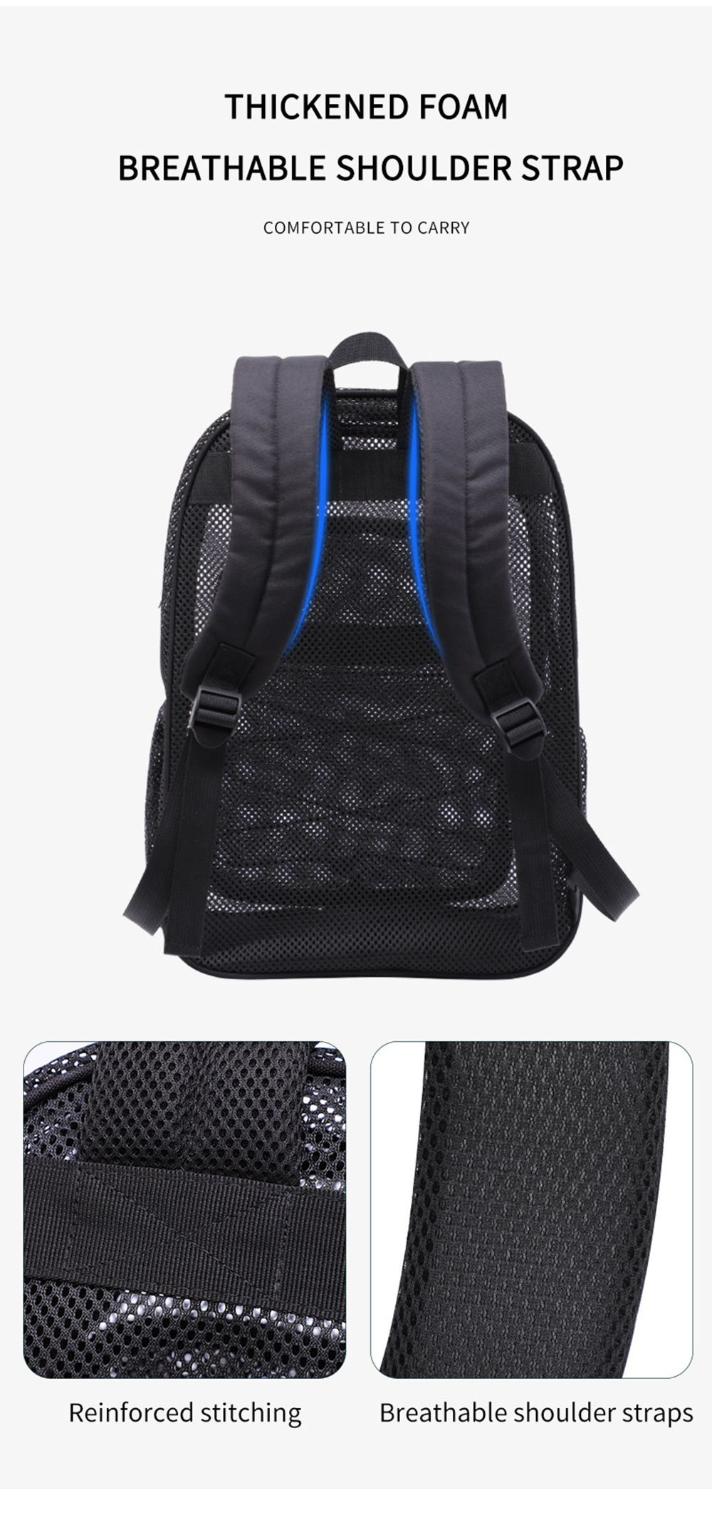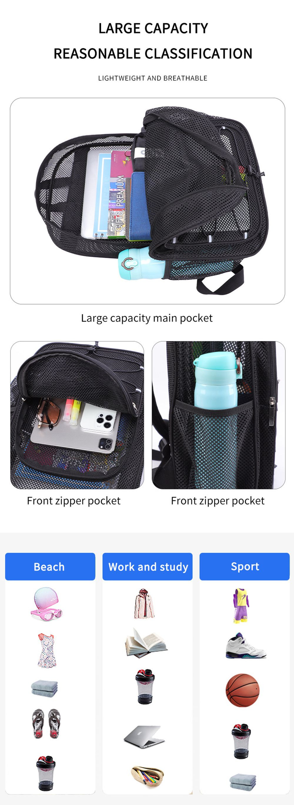 ★Unique Mesh Design: The special feature of the mesh backpack makes it have a good ventilation condition. So it is ideal for you to keep your sweaty gym clothes or wet swimsuit in the mesh backpack in order to dry them out quicker.