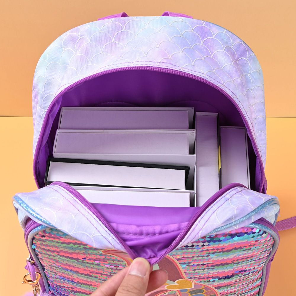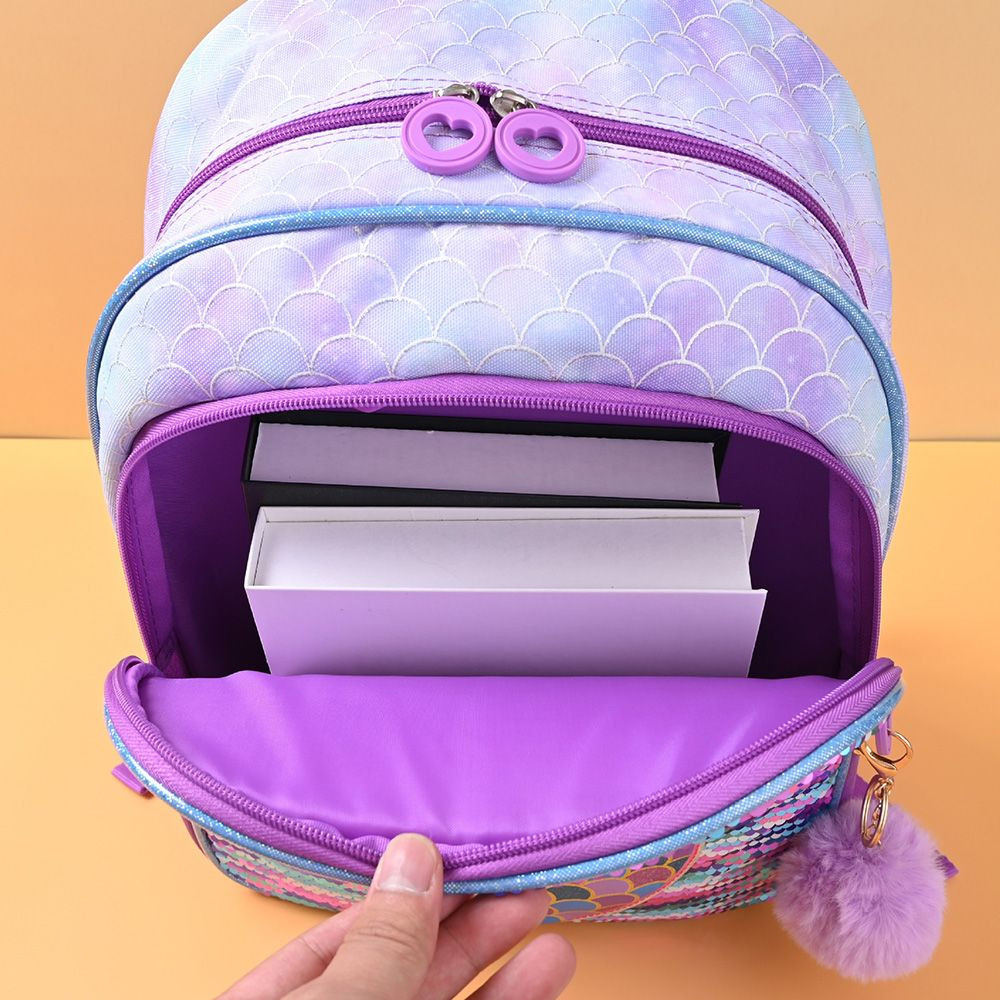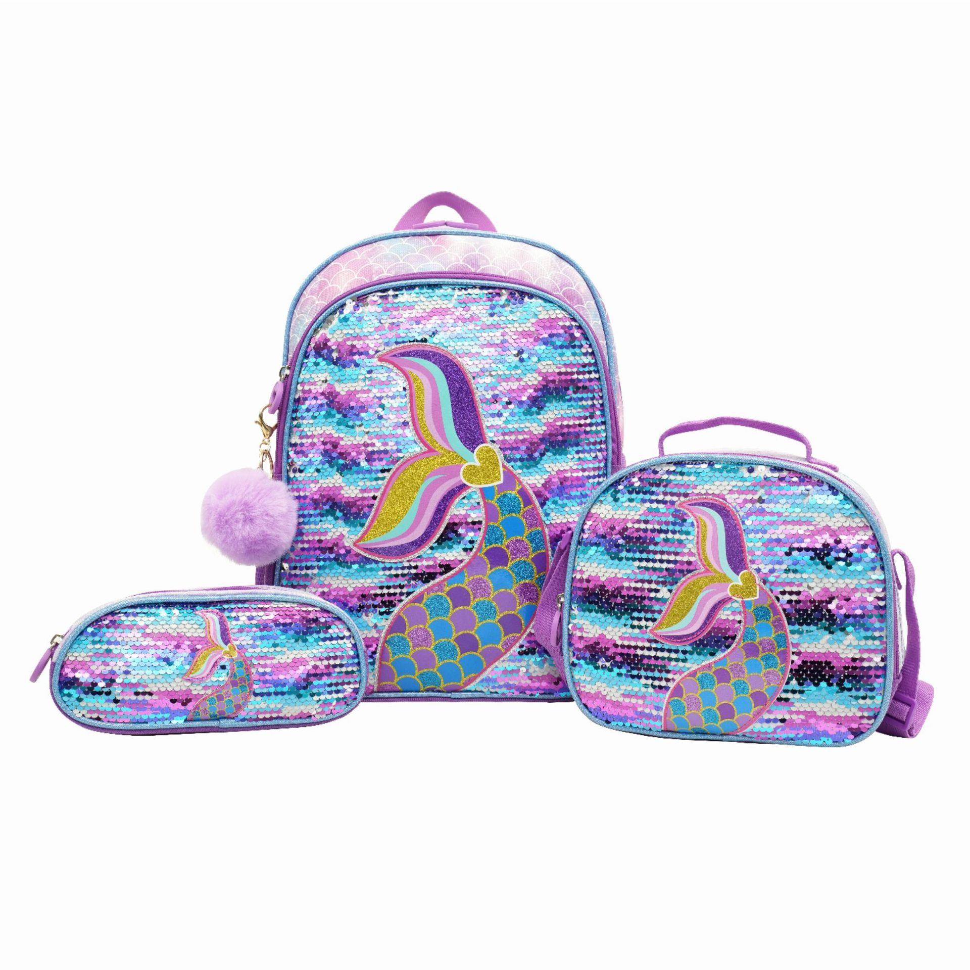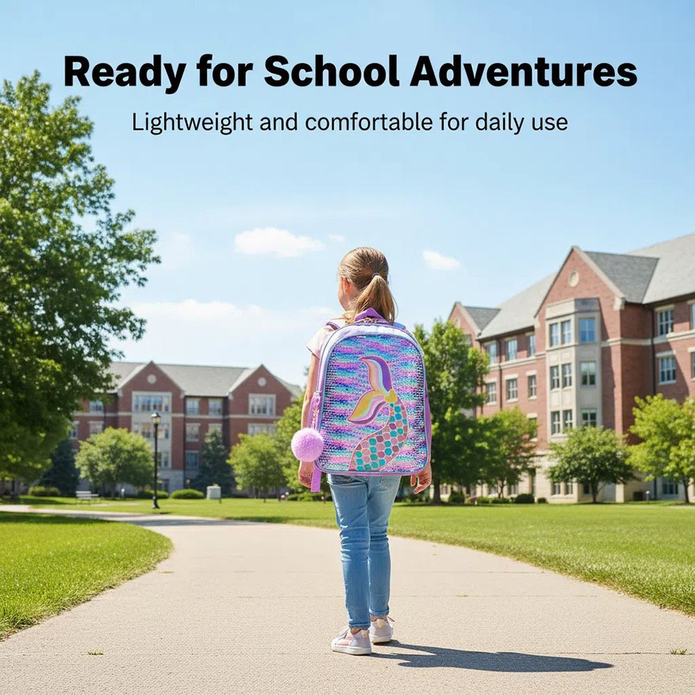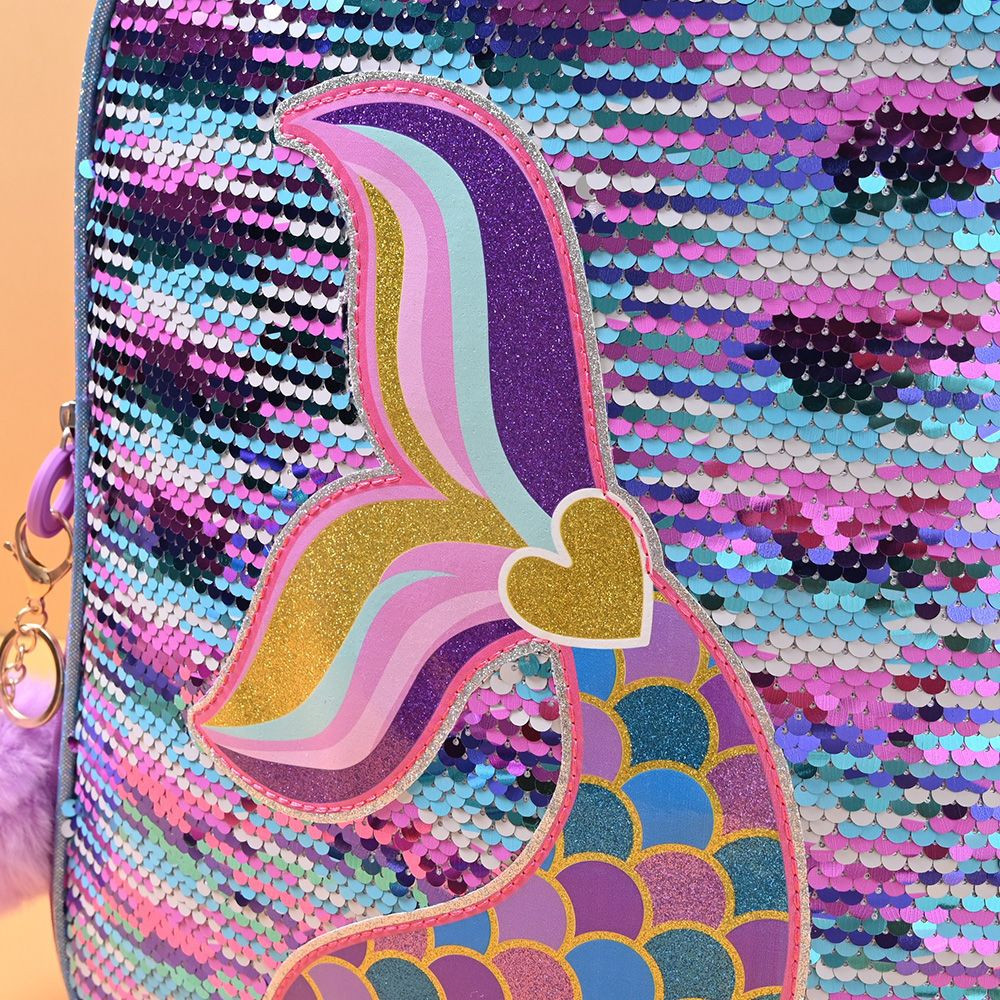 - Stunning Craftsmanship: Made with reversible sequin fabric—just brush the surface to switch between dreamy pink-blue-purple gradient effects. The bag features a 3D embroidered mermaid tail (adorned with pink/purple/blue scales and gold trim) for intricate, charming detail; the backpack also comes with a fluffy purple pom-pom charm to boost its cuteness.
