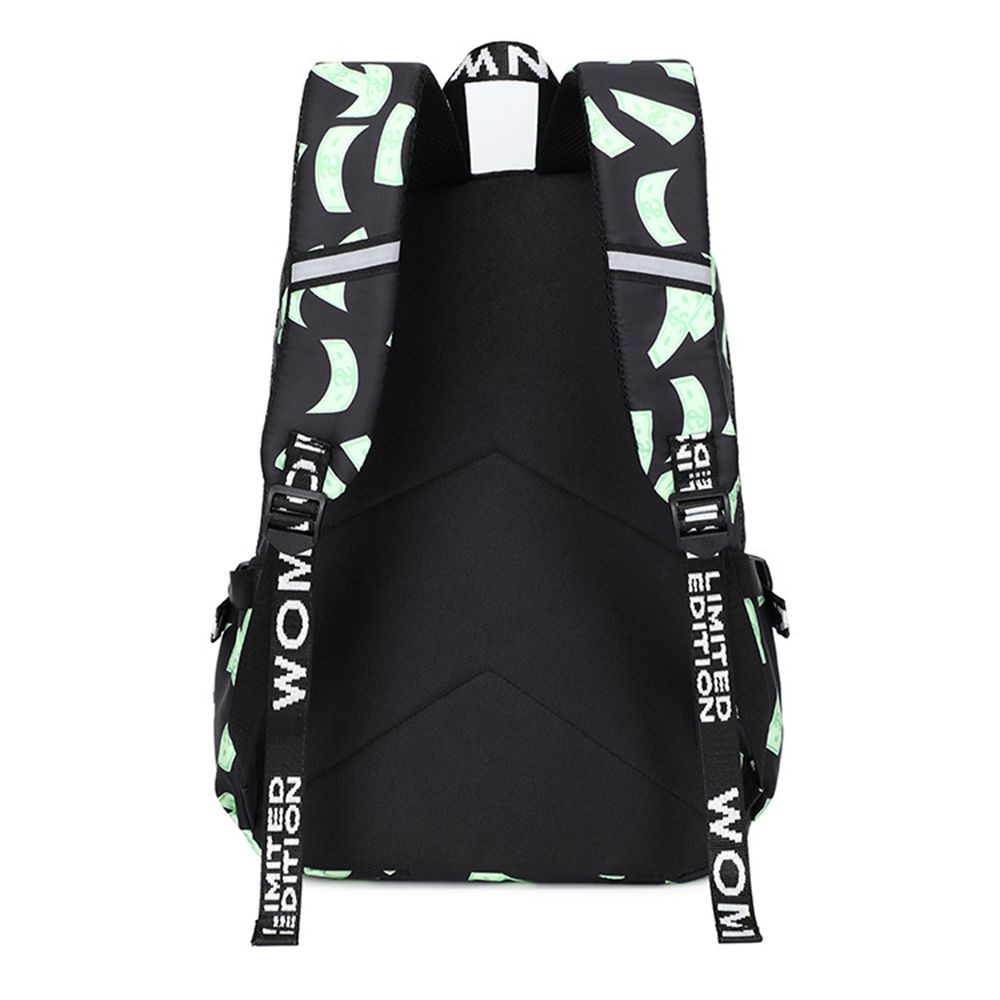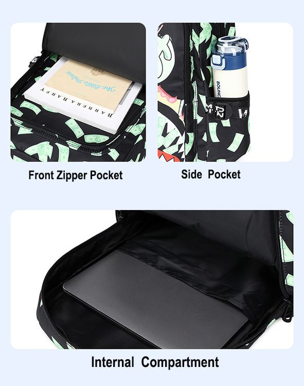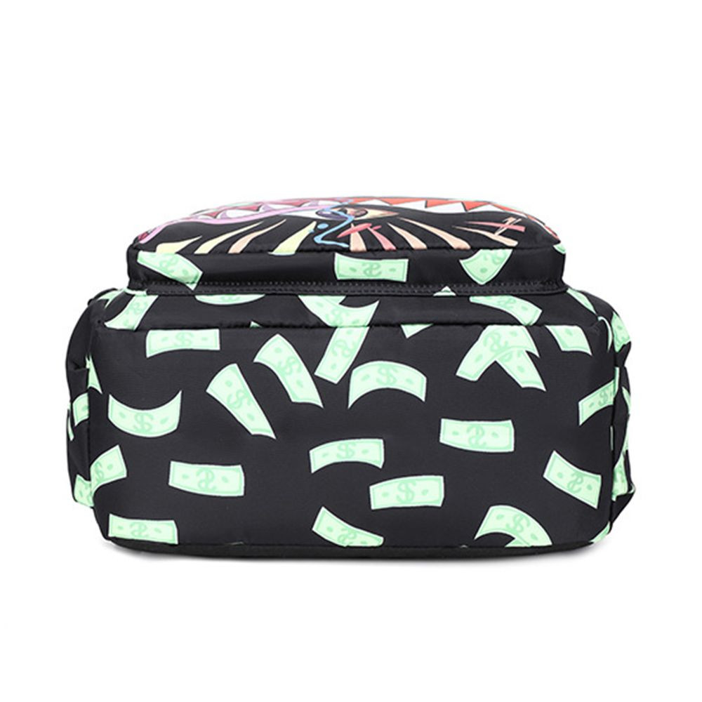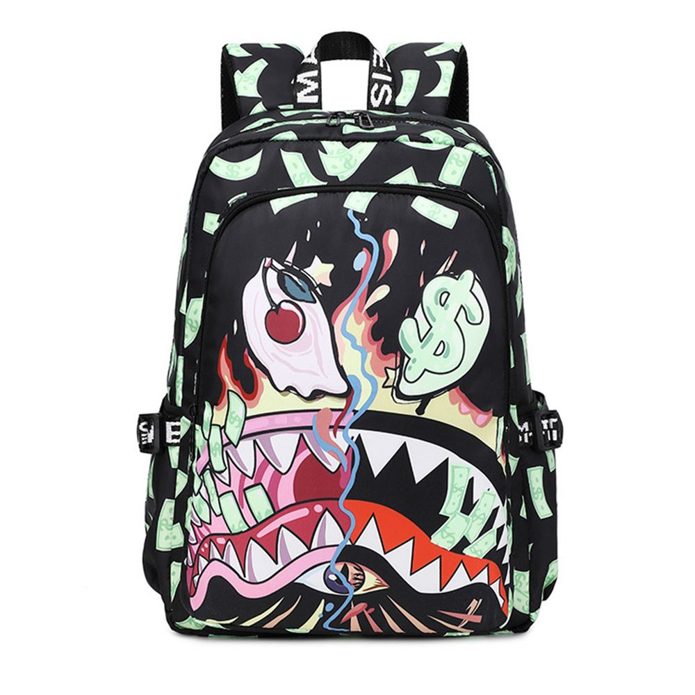 This trendy school backpack boasts a sleek black base + neon dollar-print pattern, paired with a bold "shark + money-eye" street-art graphic—100% unique, no style duplication. Perfect for teen students, it fits campus commutes, daily outings, and casual scenarios, making it a must-have fashion backpack for trend seekers.